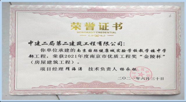 2021年12月6日,中國(guó)施工企業(yè)管理協(xié)會(huì)公布2020-2021國(guó)家優(yōu)質(zhì)工程獎(jiǎng)獲獎(jiǎng)名單,河西集團(tuán)新城公司所屬南京河西工程項(xiàng)目管理有限公司代建的南京國(guó)際健康城實(shí)驗(yàn)學(xué)校項(xiàng)目喜獲該獎(jiǎng)項(xiàng)。國(guó)家優(yōu)質(zhì)工程獎(jiǎng)設(shè)立于1981年,是經(jīng)國(guó)務(wù)院確認(rèn)的我國(guó)工程建設(shè)領(lǐng)域設(shè)立最早,規(guī)格最高,跨行業(yè)、跨專(zhuān)業(yè)的國(guó)家級(jí)質(zhì)量獎(jiǎng)。