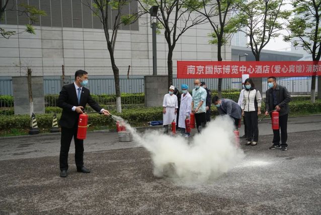 南京國(guó)際博覽中心酒店全體員工集體參與了消防演練。此次演練分為安全疏散、醫(yī)療救護(hù)和滅火演練三個(gè)部分。