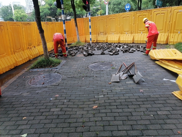 松花江西街是奧體中心片區(qū)成熟的住宅以及學(xué)校片區(qū)道路,兩側(cè)行道樹栽種的是梧桐樹,梧桐樹冠高大,夏季遮陰,冬季透光,但是由于根系發(fā)達,樹根會鼓出來把人行道磚“拱”起,一些路面變得凹凸不平,影響行人通行和道路美觀。公司市政養(yǎng)護隊伍在動工前,全面細致的排查了該路段,對各類隱患、病害問題進行了分類整理,并“一點一案”,制定整治解決方案。