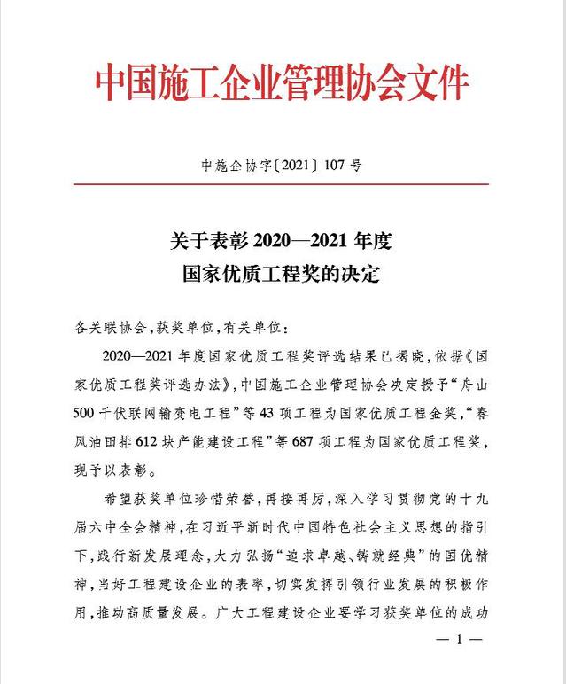 2021年12月6日,中國施工企業(yè)管理協(xié)會公布2020-2021國家優(yōu)質(zhì)工程獎獲獎名單,河西集團(tuán)新城公司所屬南京河西工程項(xiàng)目管理有限公司代建的招商銀行南京分行招銀大廈項(xiàng)目喜獲該獎項(xiàng)。國家優(yōu)質(zhì)工程獎設(shè)立于1981年,是經(jīng)國務(wù)院確認(rèn)的我國工程建設(shè)領(lǐng)域設(shè)立最早,規(guī)格最高,跨行業(yè)、跨專業(yè)的國家級質(zhì)量獎。