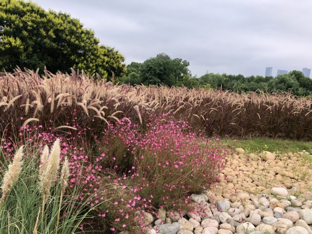 紫金文創(chuàng)園屋頂花園提升項目將植物配置進行全面提檔升級,把原有枯黃退化、高低不平的狗牙根草地進行翻新整地,栽植了薄雪萬年草,紅葉景天,粉黛亂子草、紫穗狼尾草等灌木和草本植物,既保證了屋頂承重的要求,又形成了野趣的屋頂景觀效果。