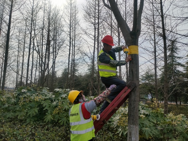 這項(xiàng)舉措不僅可以大大降低綠化養(yǎng)護(hù)成本,并且還不存在農(nóng)藥殘留,不污染環(huán)境。目前公司綠化養(yǎng)護(hù)人員已經(jīng)對(duì)嗇園路83株欒樹(shù)、蒼山路的20余株紫葉李進(jìn)行了膠帶黏蟲(chóng)實(shí)驗(yàn),后期公司將持續(xù)進(jìn)行觀察,來(lái)檢驗(yàn)其防治效果,為后期開(kāi)展病蟲(chóng)害防治提供寶貴的科學(xué)依據(jù)。