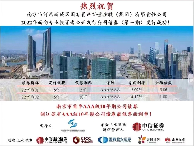 本次發(fā)行為批文下首期發(fā)行,由中信證券擔(dān)任牽頭主承銷商及簿記管理人,在主承銷商的共同努力下獲得了圓滿成功。本次發(fā)行獲得了市場投資者的高度認可,體現(xiàn)了投資人對河西集團未來業(yè)務(wù)發(fā)展的強烈信心!本次發(fā)行的10年期品種,亦為南京市首單10年期公司債券。河西集團本次發(fā)行10年期公司債券,以較低的融資成本鎖定了長期的資金需求,充分體現(xiàn)河西集團對市場時機的準確把握以及對直融市場融資工具成熟的使用能力,為債券市場作出了積極的示范效應(yīng)。