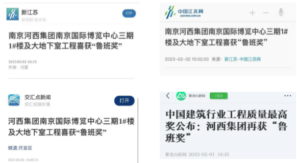 編者按:企業(yè)高質(zhì)量發(fā)展,離不開(kāi)高品質(zhì)的產(chǎn)品。2022—2023年度第一批中國(guó)建設(shè)工程魯班獎(jiǎng)名單近日公布,由河西集團(tuán)投資,集團(tuán)新城公司代建的南京國(guó)際博覽中心三期1#樓及大地下室工程榜上有名。對(duì)此,交匯點(diǎn)新聞、中國(guó)江蘇網(wǎng)、紫金山新聞等省市多家主要媒體進(jìn)行了專(zhuān)題報(bào)道。