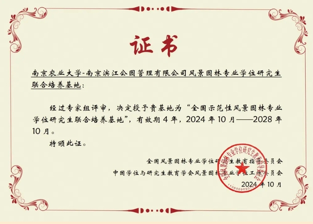 近日,全國(guó)風(fēng)景園林專業(yè)學(xué)位研究生教育指導(dǎo)委員會(huì)正式公布了2024年“全國(guó)示范性風(fēng)景園林專業(yè)學(xué)位研究生聯(lián)合培養(yǎng)基地”名單。南京濱江公園管理有限公司與南京農(nóng)業(yè)大學(xué)合作共建的“南京農(nóng)業(yè)大學(xué)—南京濱江公園管理有限公司風(fēng)景園林專業(yè)學(xué)位研究生聯(lián)合培養(yǎng)基地”,憑借卓越的聯(lián)合培養(yǎng)成效和深厚的校企合作基礎(chǔ),再次獲此資質(zhì)。