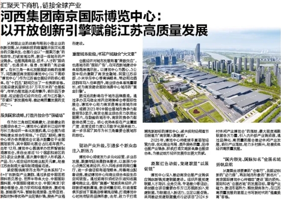 2025年全國“兩會”期間,揚子晚報全媒體平臺推出《春天的號角》專題報道,總結(jié)江蘇各地各部門在推進高質(zhì)量發(fā)展中取得的新進展、新成果,展望新的一年奮進路上的新希望、新作為。3月6日,《揚子晚報》刊登河西集團南京國際博覽中心深度專題報道,展現(xiàn)博覽中心在“十四五”期間高質(zhì)量完成規(guī)劃目標(biāo)任務(wù),努力在行業(yè)領(lǐng)域營造更加充分的先行優(yōu)勢,在江蘇高質(zhì)量發(fā)展的藍圖上書寫新時代的“強富美高”答卷。